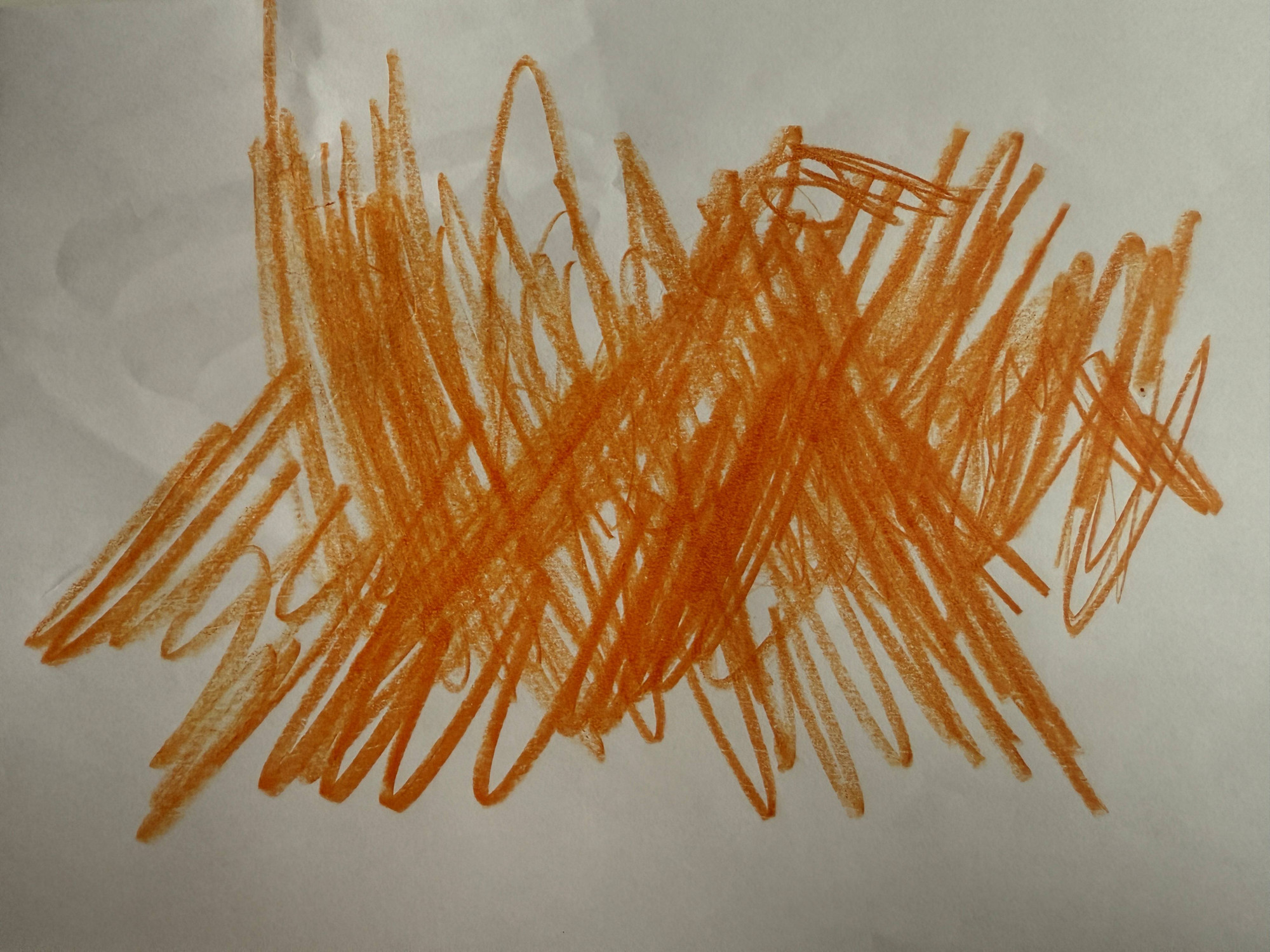 Tomi először óvatos, aztán egyszer csak magával ragadja a lendület. A narancssárga ceruza alatt cikázni kezdenek a vonalak, tüzes hullámok töltik meg a lapot: a sárkány végre kifújhatja magát.