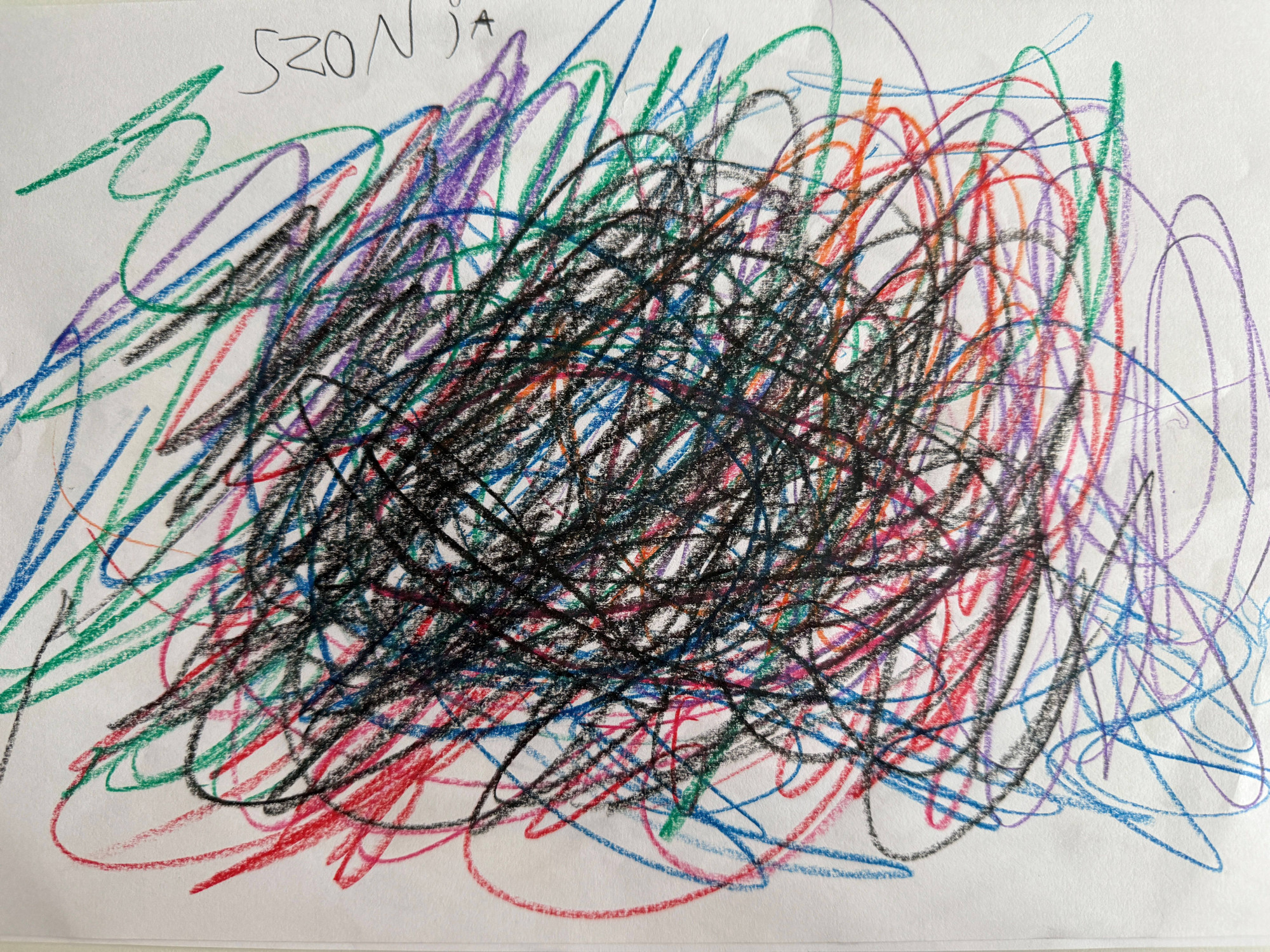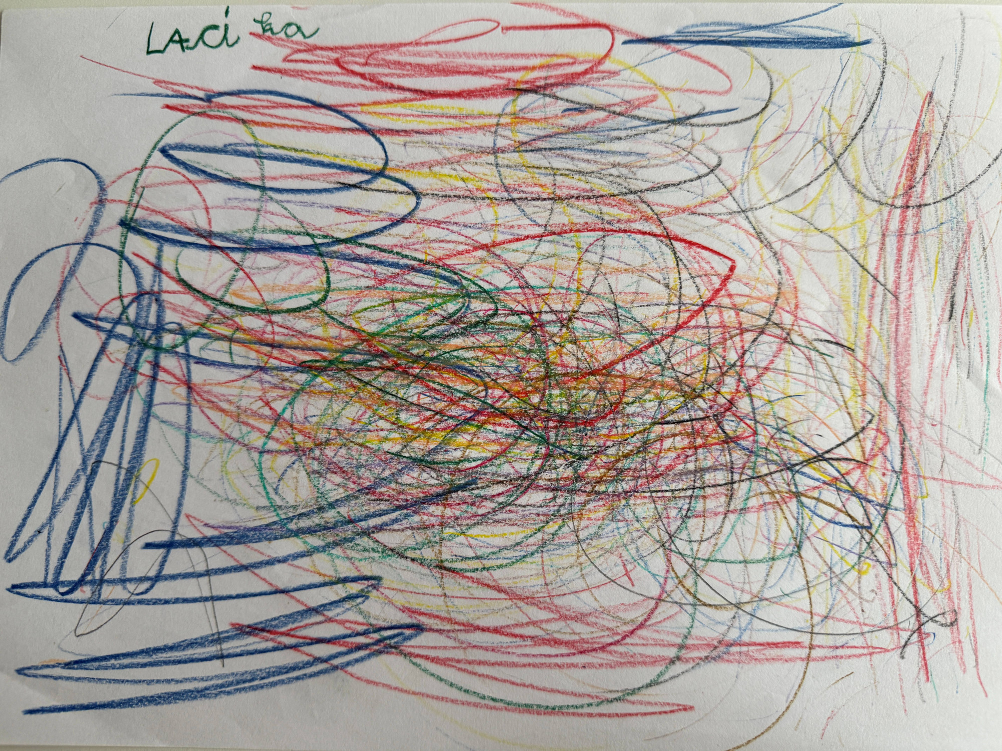 A másodikos Lacikát kiemelték a családból, nevelőotthonban él több testvérével együtt. Éjszakánként bepisil és gyakran változnak a nevelői az otthonban, ahol az erőfölény érvényesül: a nagyobbak bántják a kicsiket, egymástól el-elvesznek tárgyakat, élelmet. A Sulinyugi foglalkozáson minden technikát intenzíven, nagy erőbedobással él meg, a firkánál pedig extrán felcsillan a szeme: „Ezt most tényleg lehet? Szabad nekem ezt a lapot összefirkálni, csak úgy?” kérdezi a tekintete. Ebben el is tud mélyedni, most nem kell figyelni arra, hogy leválasszuk a mögötte ülőtől: meditatív állapotban üríti ki a dühét… csak úgy serceg a keze alatt a papírlap, neki külön is adunk ceruzát, mert gyorsan koptatja a saját színesét. Büszkén szemléli a saját „művét” majd a többiekére is érdeklődve tekint.
